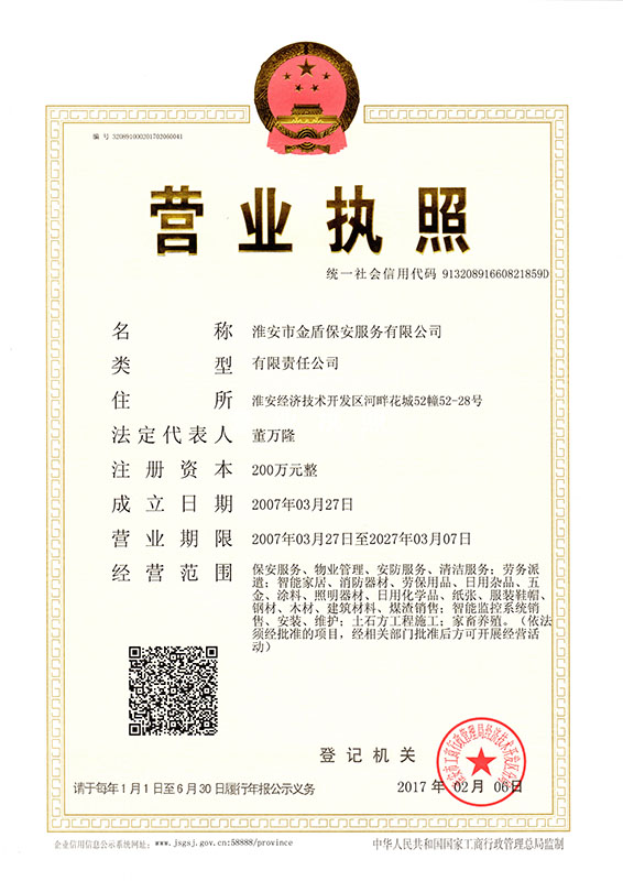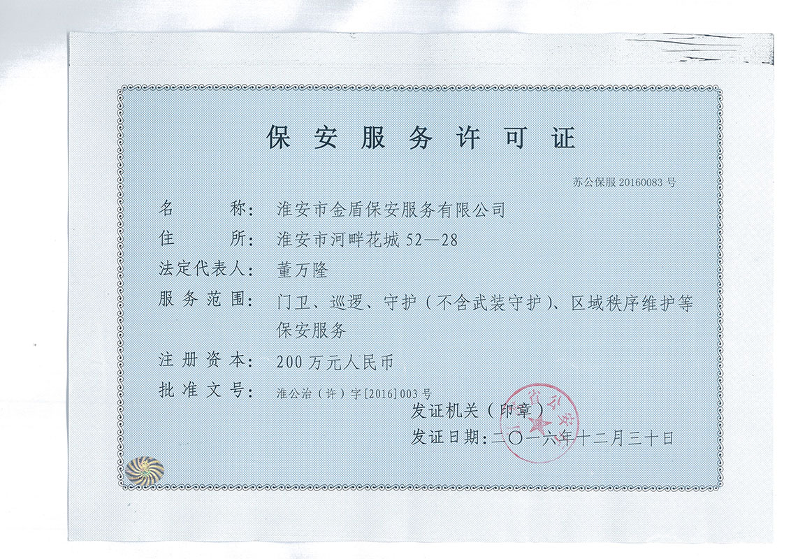 金盾保安在通过长期的保安服务工作,总结出一套完善的保安服务管理机制、管理理念、保安管理组织架构、保安服务操作流程、安全实用的保安服务应急处置措施、保安培训方案等并将以上各项纳入到公司程序文件与质量操作手册中。