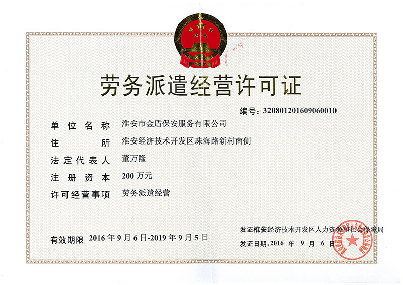 营业执照、信用机构代码、保安服务许可证、税务登记证、劳务派遣证。